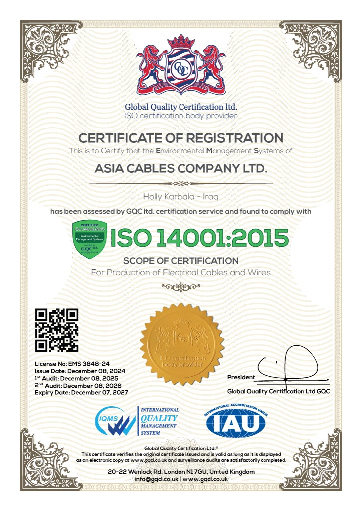 The ISO 14001 certification confirms that Asia Cables has implemented effective environmental practices, ensuring that our operations minimize their impact on the environment while adhering to international standards. By prioritizing environmental sustainability, we aim to reduce waste, conserve resources, and contribute positively to the health of our planet.