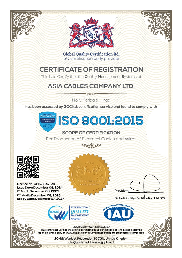 Asia Cables is proud to announce that it has been awarded the prestigious ISO 9001 certification, the international standard for quality management systems. This accomplishment reflects our unwavering commitment to excellence and customer satisfaction.